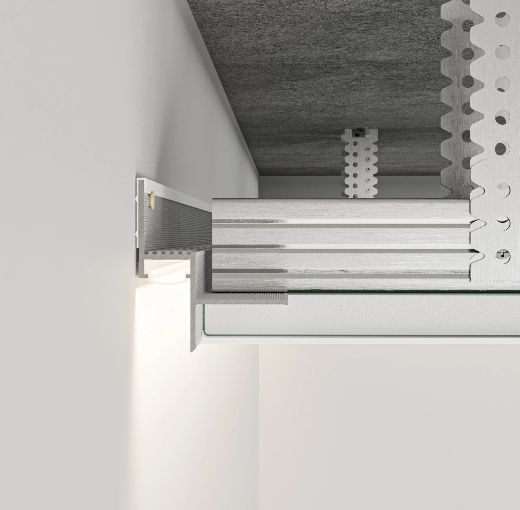 Profiliai turi integruotą vietą LED apšvietimui, leidžiančią sukurti švelnų, netiesioginį apšvietimą. LED juostos subtiliai išryškina šešėlinę liniją, pabrėžia erdvės geometriją ir suteikia jaukumo be tiesioginės šviesos šaltinių matomumo. Tokiu būdu šviesa tampa organiška architektūros dalimi, o ne atskiru interjero akcentu.